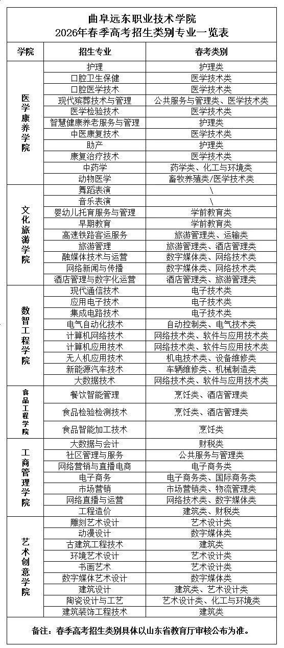 曲阜远东职业技术学院 2026年春季高考招生类别专业一览表
